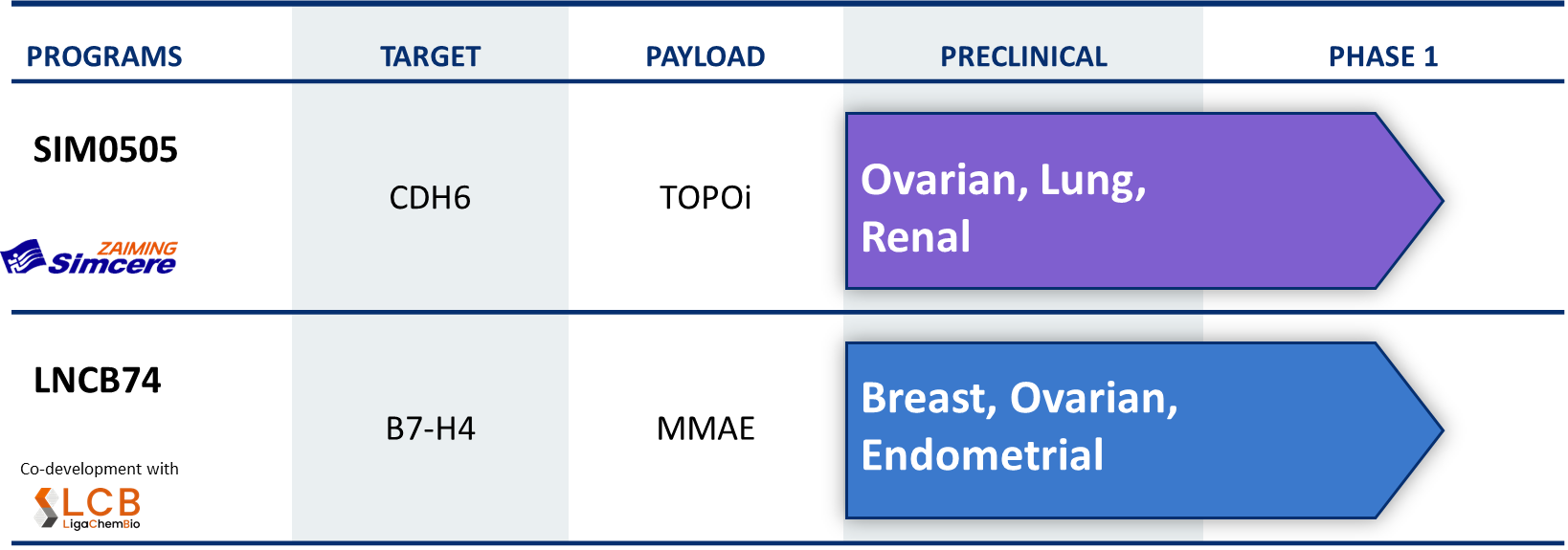 SIM0505 is an antibody-drug conjugate that binds specifically to CDH6, a validated target on tumors. CDH6 protein is expressed on multiple tumor types, including ovarian, lung and renal cancers. SIM0505 has a proprietary payload, CPT116, a topoisomerase 1 inhibitor, designed for broad anti-tumor activity and strong cytotoxicity, while offering high systemic clearance, and improved safety. Preclinical studies have demonstrated robust anti-tumor activity across multiple solid tumor models. SIM0505 is currently in Phase 1 clinical testing in U.S. and China.